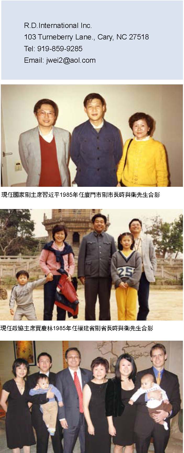 尽管老卫夫妇一手操持自己的房地产公司,一手还要负责北卡电力公司和IBM公司的软件开发设计工作,每天必须工作长达15个人小时。但他仍然是北卡侨界和社交界的名人,可谓“长袖善舞”。